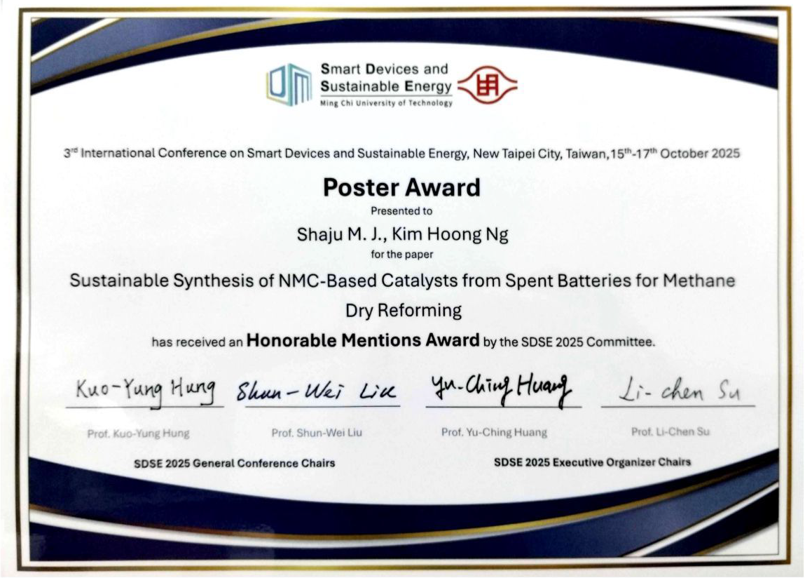 本系亦在本次研討會中表現亮眼——在黃錦鴻老師指導下,殺O同學以優異研究成果脫穎而出,榮獲銅質獎殊榮,充分展現本系在智慧元件與永續科技領域的研究實力與培育成果。